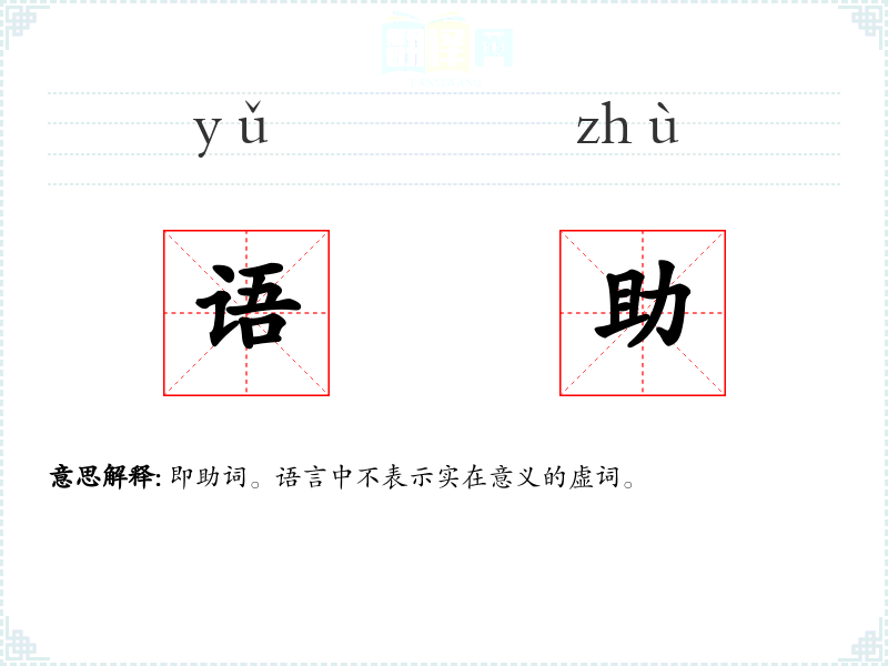 即助词。语言中不表示实在意义的虚词。