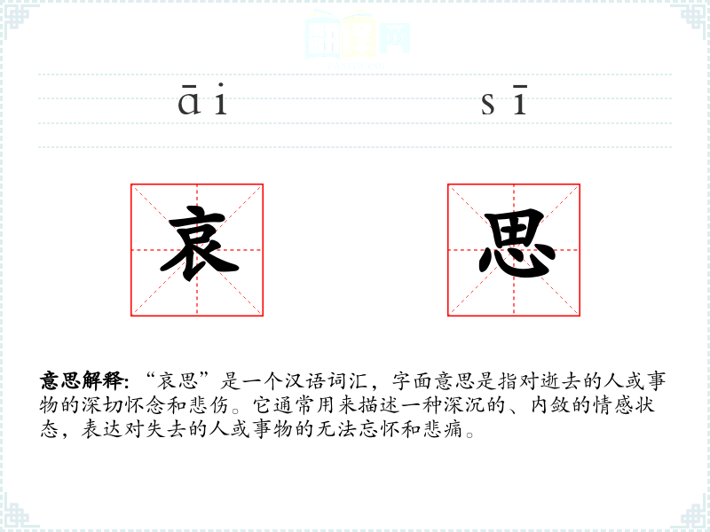 “哀思”是一个汉语词汇,字面意思是指对逝去的人或事物的深切怀念和悲伤。它通常用来描述一种深沉的、内敛的情感状态,表达对失去的人或事物的无法忘怀和悲痛。