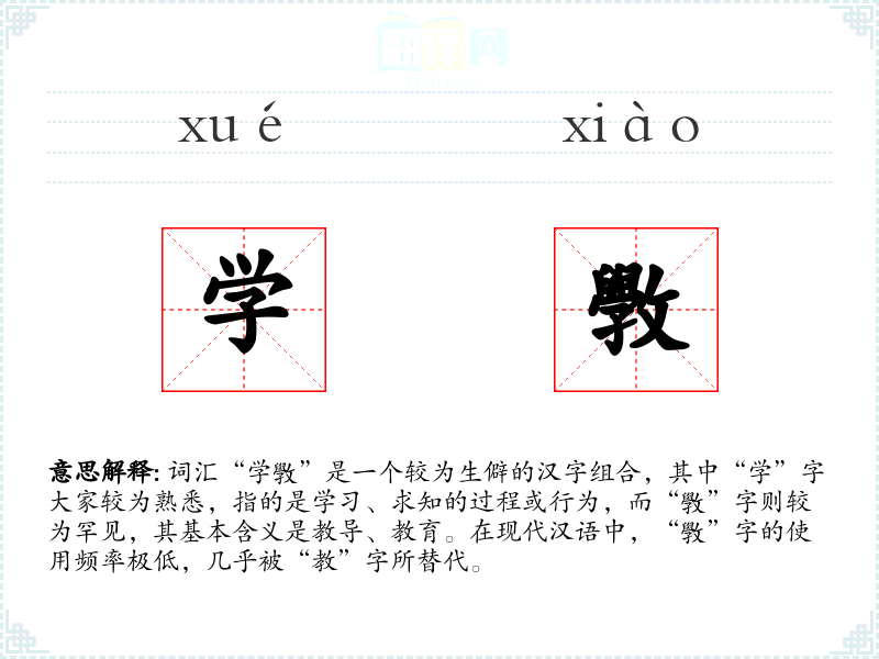 词汇“学斆”是一个较为生僻的汉字组合,其中“学”字大家较为熟悉,指的是学*、求知的过程或行为,而“斆”字则较为罕见,其基本含义是教导、教育。在现代汉语中,“斆”字的使用频率极低,几乎被“教”字所替代。