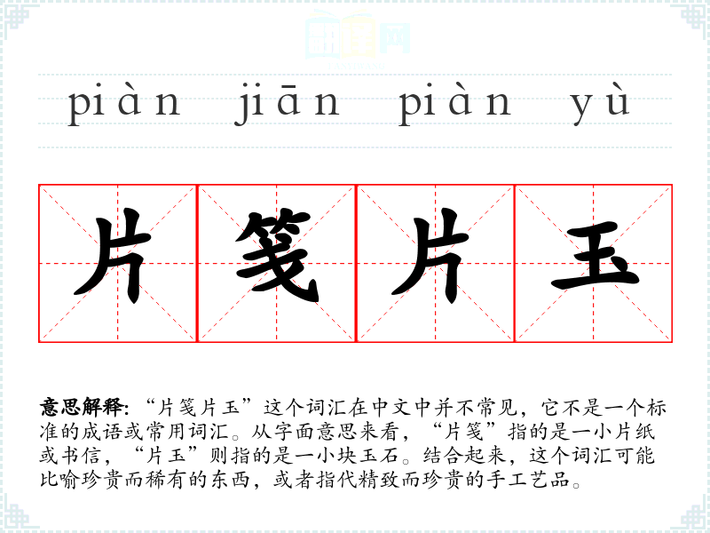 由于“片笺片玉”不是一个常用词汇,它在不同的语境中可能会有不同的解释。在文学作品中,它可能被用来形容某种精致的艺术品或手工艺品,强调其珍贵和独特。在口语中,这个词汇可能不太常用,除非是在特定的文化或艺术讨论中。