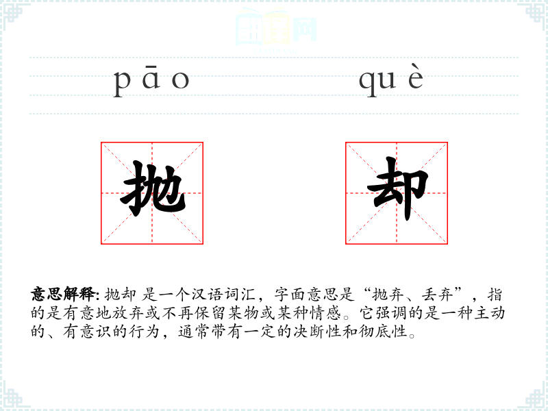 抛却 是一个汉语词汇,字面意思是“抛弃、丢弃”,指的是有意地放弃或不再保留某物或某种情感。它强调的是一种主动的、有意识的行为,通常带有一定的决断性和彻底性。