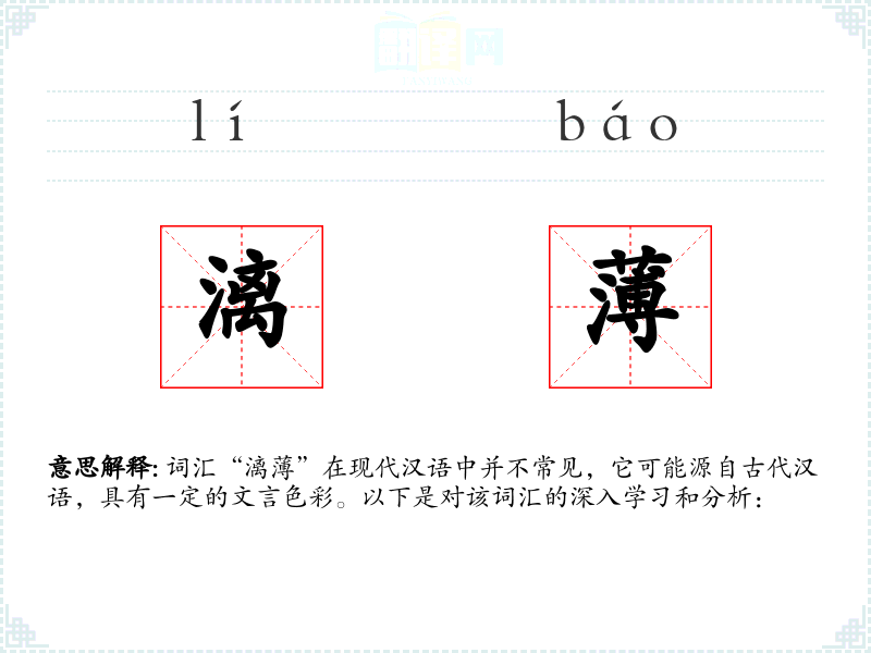 词汇“漓”在现代汉语中并不常见,它可能源自古代汉语,具有一定的文言色彩。以下是对该词汇的深入学和分析: