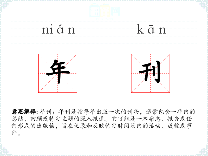 - 词源:年刊一词由“年”和“刊”组成,“年”指时间单位,“刊”指出版物。