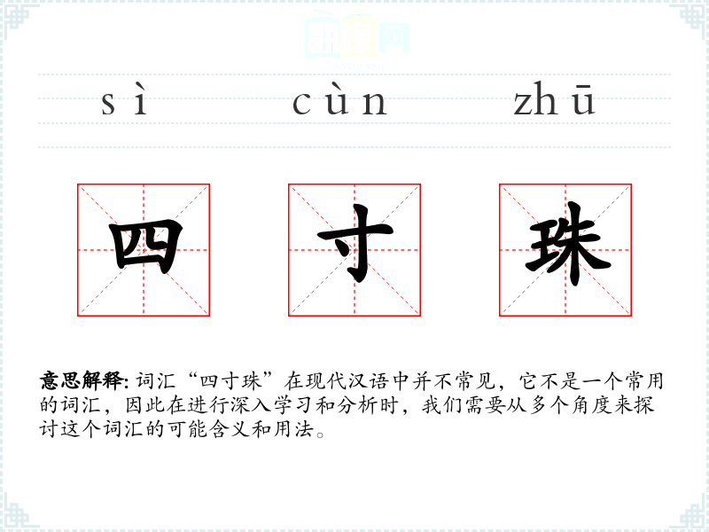 词汇“四寸珠”在现代汉语中并不常见,它不是一个常用的词汇,因此在进行深入学*和分析时,我们需要从多个角度来探讨这个词汇的可能含义和用法。