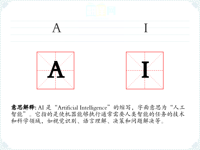 AI 是“Artificial Intelligence”的缩写,字面意思为“人工智能”。它指的是使机器能够执行通常需要人类智能的任务的技术和科学领域,如视觉识别、语言理解、决策和问题解决等。