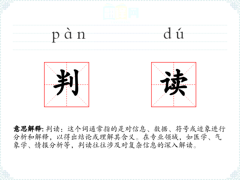 判读:这个词通常指的是对信息、数据、符号或迹象进行分析和解释,以得出结论或理解其含义。在专业领域,如医学、气象学、情报分析等,判读往往涉及对复杂信息的深入解读。