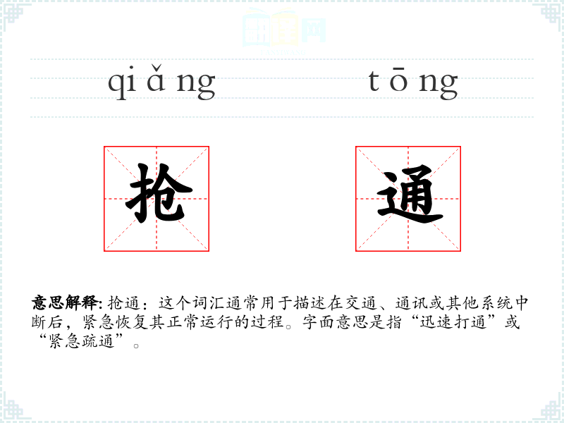 抢通:这个词汇通常用于描述在交通、通讯或其他系统中断后,紧急恢复其正常运行的过程。字面意思是指“迅速打通”或“紧急疏通”。