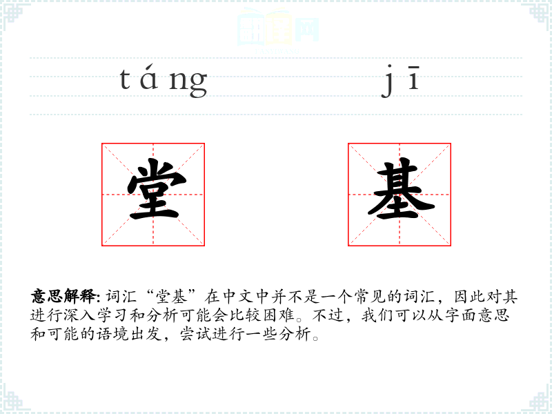 在其他语言中,可能没有直接对应“堂基”的词汇,但可以找到类似的表达,如英语中的“foundation of the hall”。