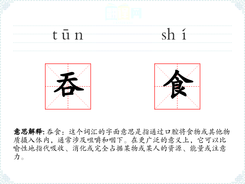 吞食:这个词汇的字面意思是指通过口腔将食物或其他物质摄入体内,通常涉及咀嚼和咽下。在更广泛的意义上,它可以比喻性地指代吸收、消化或完全占据某物或某人的资源、能量或注意力。