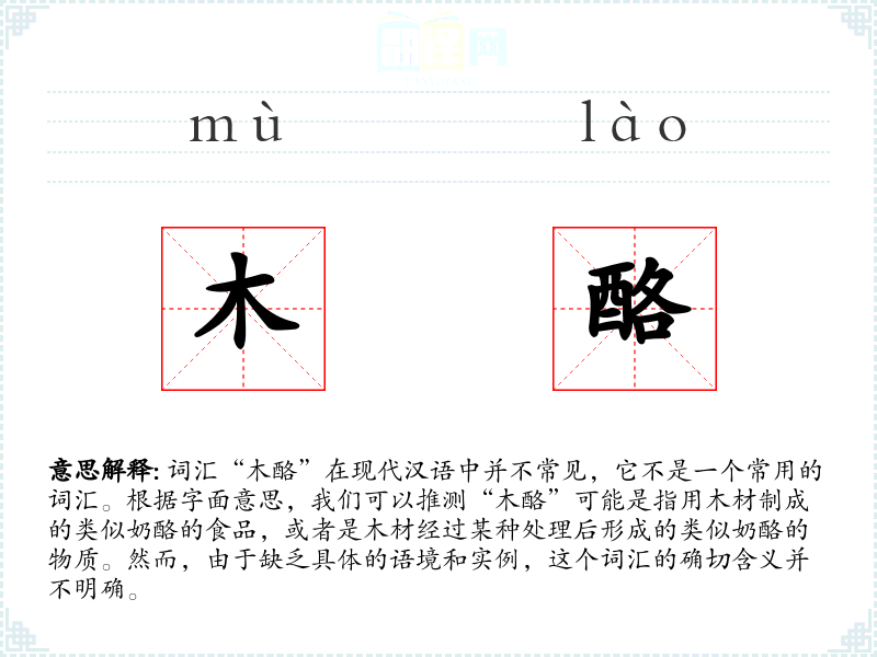 “木酪”的字面意思是由“木”和“酪”两个字组成。其中,“木”通常指木材或木制品,而“酪”通常指奶酪或类似的乳制品。因此,“木酪”可能是指一种与木材和奶酪都有关的物质或产品。