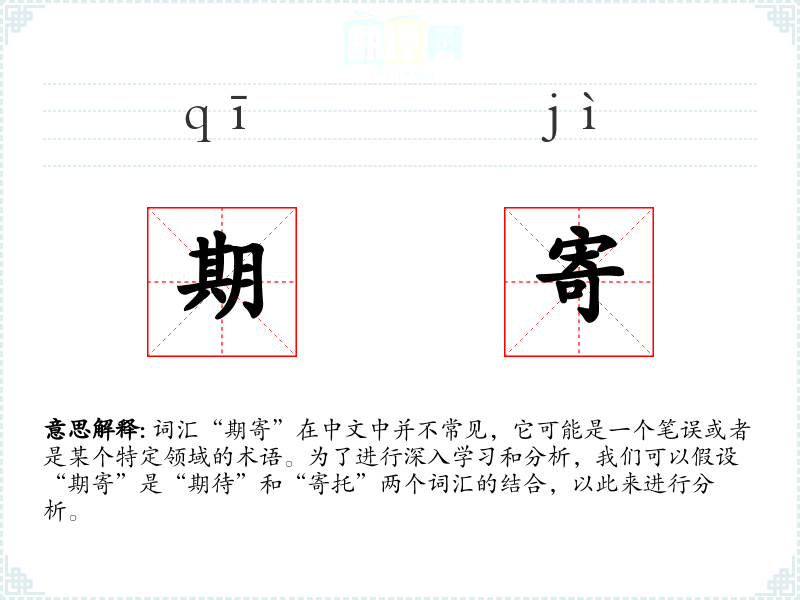 - 词源:由于“期寄”不是一个常用词汇,其词源不明确。可能是由“期待”和“寄托”两个词汇结合而来。