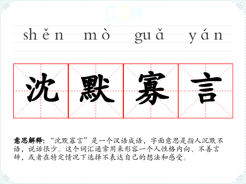 “沈默寡言”是一个汉语成语,字面意思是指人沉默不语,说话很少。这个词汇通常用来形容一个人性格内向、不善言辞,或者在特定情况下选择不表达自己的想法和感受。