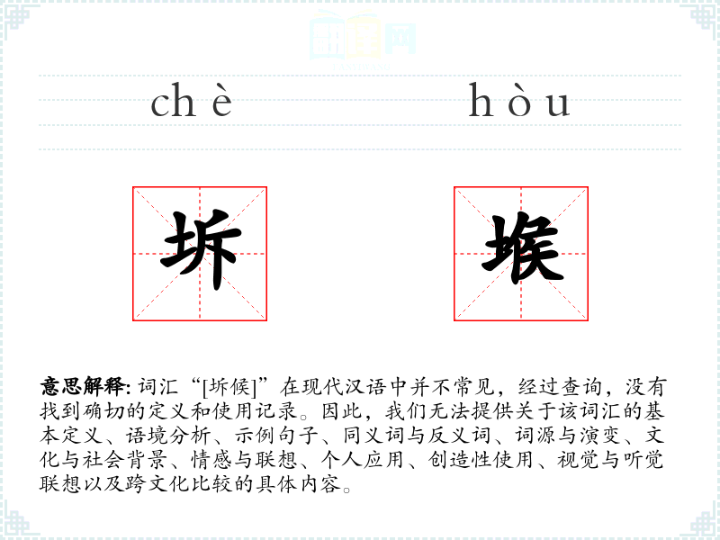 由于缺乏具体的信息和使用实例,我们对“坼候”的分析只能停留在推测层面。在实际的语言学习和研究中,对于不常见的词汇,通常需要查阅更多的资料和文献,以获得更准确的理解。