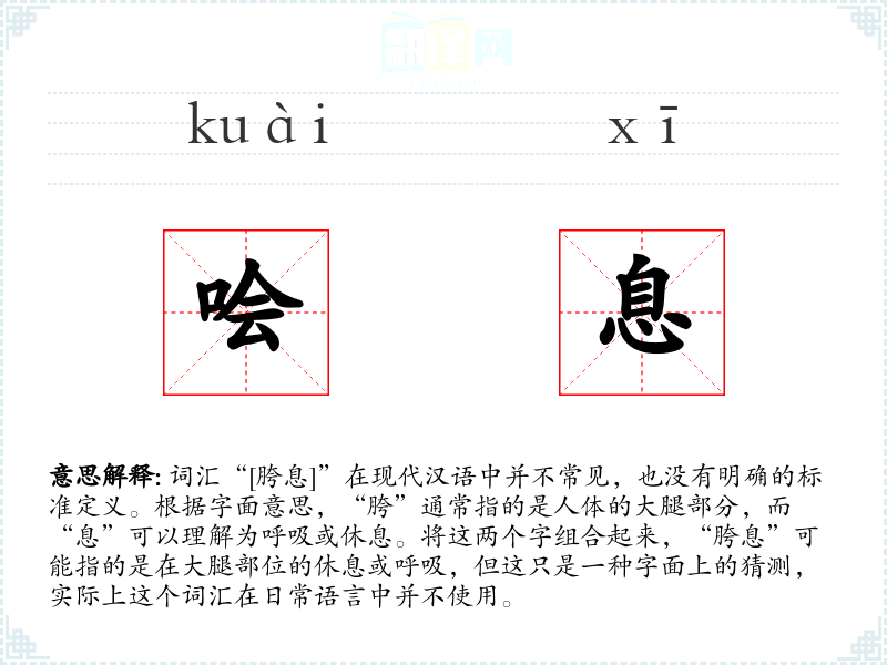 词汇“[胯息]”在现代汉语中并不常见,也没有明确的标准定义。根据字面意思,“胯”通常指的是人体的大腿部分,而“息”可以理解为呼吸或休息。将这两个字组合起来,“胯息”可能指的是在大腿部位的休息或呼吸,但这只是一种字面上的猜测,实际上这个词汇在日常语言中并不使用。