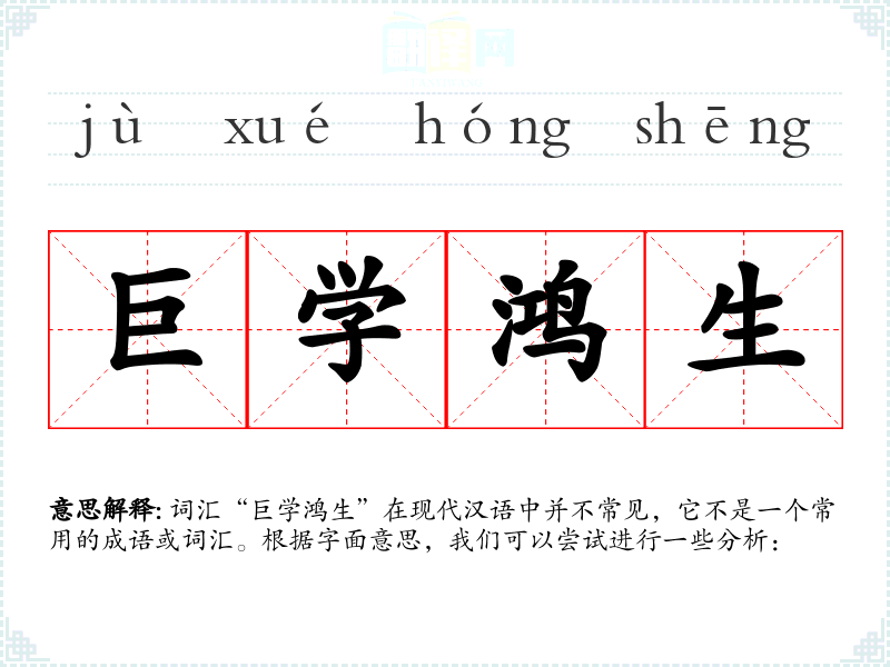词汇“巨学鸿生”在现代汉语中并不常见,它不是一个常用的成语或词汇。根据字面意思,我们可以尝试进行一些分析: