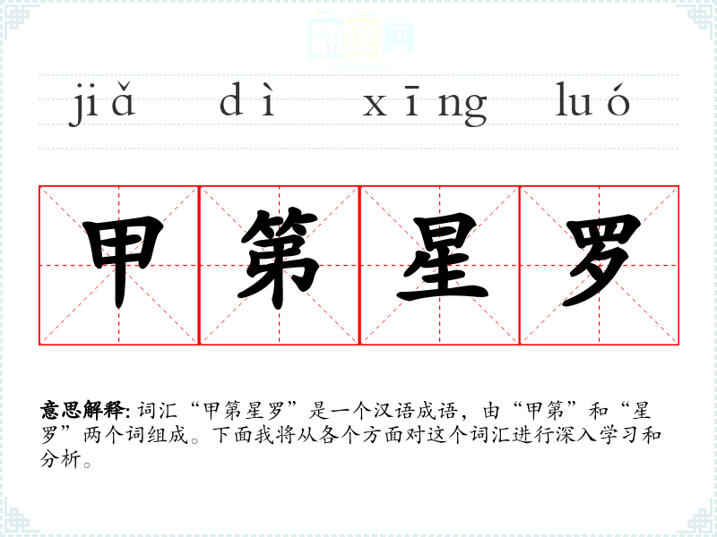 词汇“甲第星罗”是一个汉语成语,由“甲第”和“星罗”两个词组成。下面我将从各个方面对这个词汇进行深入学*和分析。