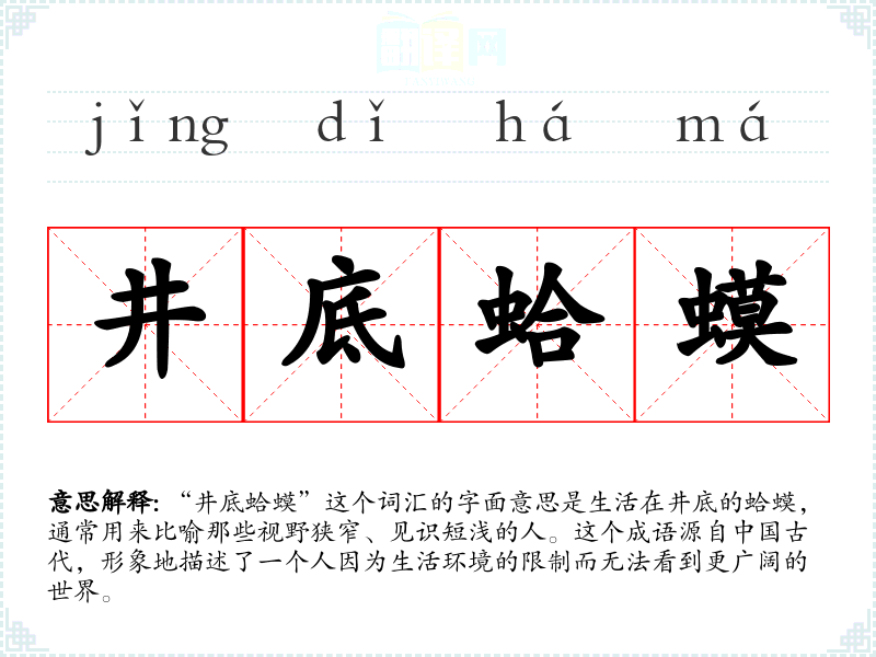 “井底蛤蟆”这个词汇的字面意思是生活在井底的蛤蟆,通常用来比喻那些视野狭窄、见识短浅的人。这个成语源自**古代,形象地描述了一个人因为生活环境的限制而无法看到更广阔的世界。