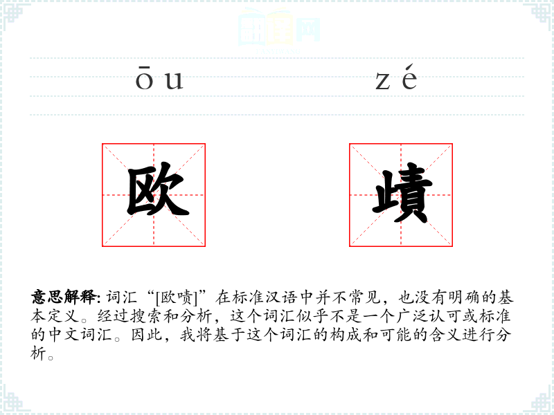 由于“[欧啧]”不是一个标准词汇,我们无法给出确切的基本定义。但从字面上看,“欧”可能与“欧洲”或“欧式”有关,而“啧”在中文中常用来表示咂嘴声,有时也用来形容事物令人赞叹或惊讶。