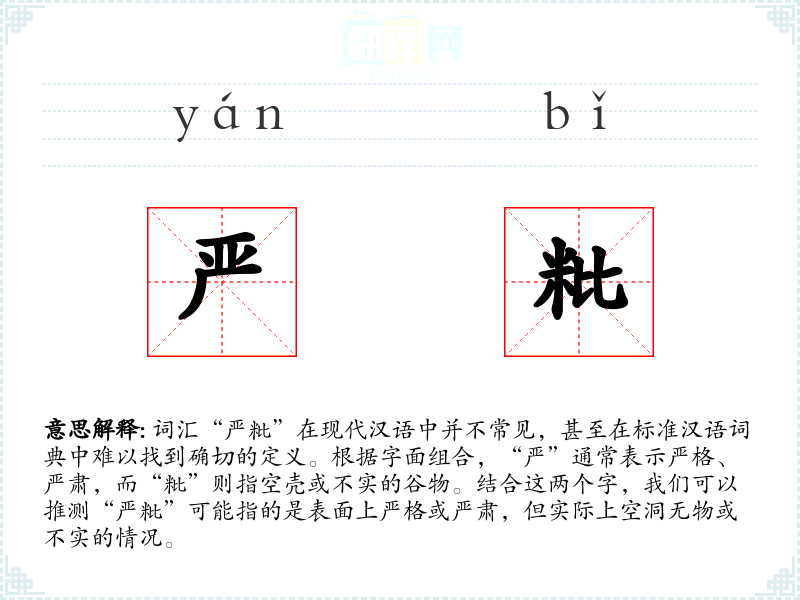 词汇“严粃”在现代汉语中并不常见,甚至在标准汉语词典中难以找到确切的定义。根据字面组合,“严”通常表示严格、严肃,而“粃”则指空壳或不实的谷物。结合这两个字,我们可以推测“严粃”可能指的是表面上严格或严肃,但实际上空洞无物或不实的情况。