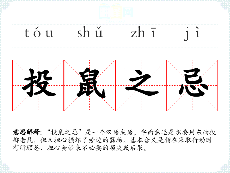 “投鼠之忌”是一个汉语成语,字面意思是想要用东西投掷老鼠,但又担心损坏了旁边的器物。基本含义是指在采取行动时有所顾忌,担心会带来不必要的损失或后果。