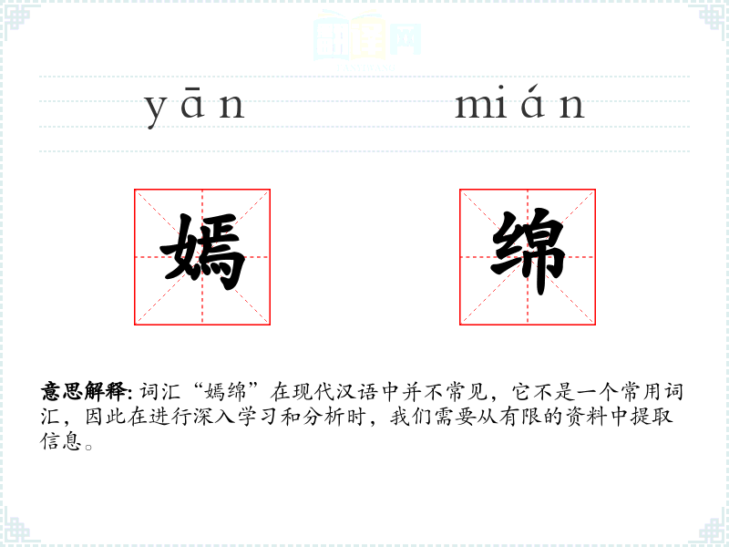 词汇“嫣绵”在现代汉语中并不常见,它不是一个常用词汇,因此在进行深入学*和分析时,我们需要从有限的资料中提取信息。