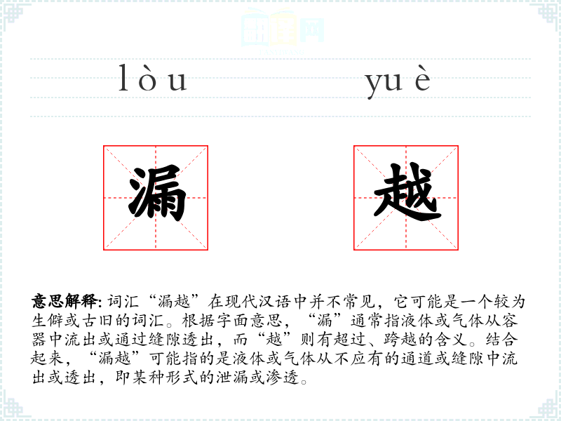 词汇“漏越”在现代汉语中并不常见,它可能是一个较为生僻或古旧的词汇。根据字面意思,“漏”通常指液体或气体从容器中流出或通过缝隙透出,而“越”则有超过、跨越的含义。结合起来,“漏越”可能指的是液体或气体从不应有的通道或缝隙中流出或透出,即某种形式的泄漏或渗透。