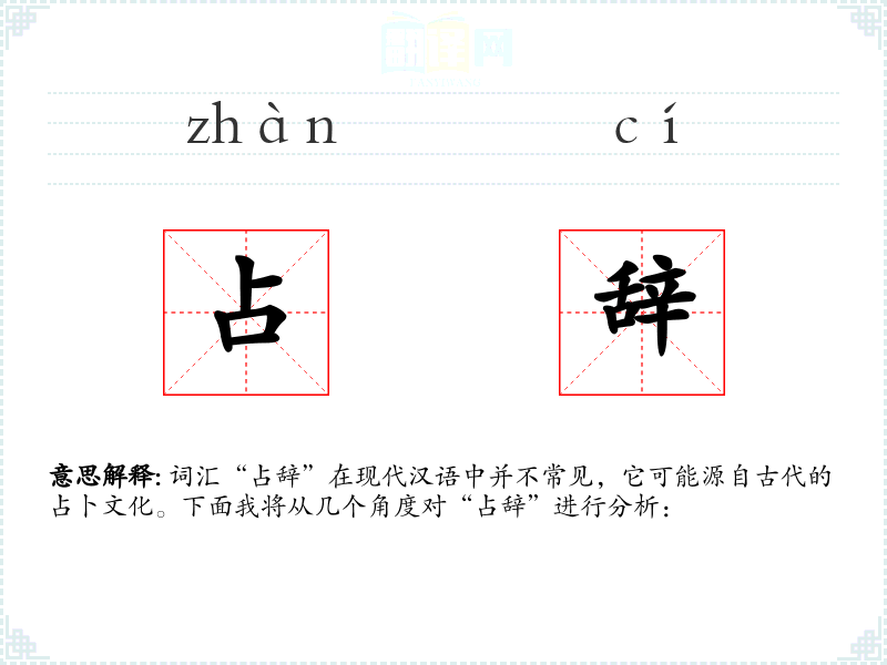 词汇“占辞”在现代汉语中并不常见,它可能源自古代的占卜文化。下面我将从几个角度对“占辞”进行分析: