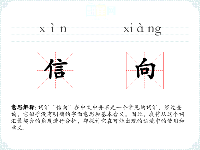 由于“信向”不是一个标准词汇,我们无法给出确切的基本定义。它可能是由两个字“信”和“向”组合而成的,其中“信”可以表示信任、信仰或信件,而“向”可以表示方向、朝向或趋势。因此,“信向”可能指的是信任或信仰的方向,或者信件的传递方向。