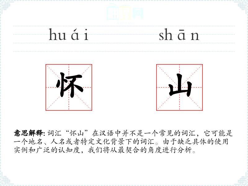 词汇“怀山”在汉语中并不是一个常见的词汇,它可能是一个地名、人名或者特定文化背景下的词汇。由于缺乏具体的使用实例和广泛的认知度,我们将从最契合的角度进行分析。