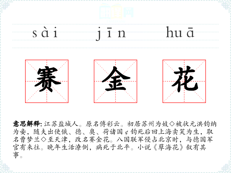 1.江苏盐城人。原名傅彩云。初居苏州为妓◇被状元洪钧纳为妾,随夫出使俄、德、奥、荷诸国¢钧死后回上海卖笑为生,取名曹梦兰◇至天津,改名赛金花。八国联军侵占北京时,与德国军官有来往。晚年生活潦倒,病死于北平。小说《孽海花》叙有其事。
