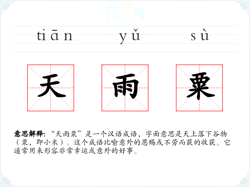 “天雨粟”这个成语可能源自古代的神话故事,其中天神为了帮助人类,从天上降下谷物。随着时间的推移,这个成语被用来形容各种意外的好运或收获。