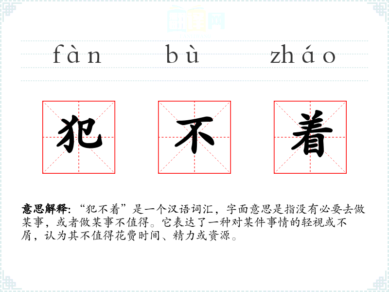 - 文学语境:在文学作品中,作者可能使用“犯不着”来表达角色的内心活动,展现其对某件事情的轻蔑或不屑。