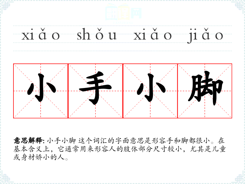 小手小脚 这个词汇的字面意思是形容手和脚都很小。在基本含义上,它通常用来形容人的肢体部分尺寸较小,尤其是儿童或身材娇小的人。