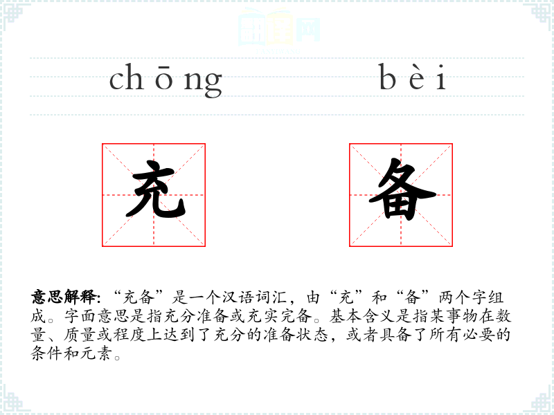 - 口语语境:在日常对话中,“充备”可以用来描述某人或某事已经做好了充分的准备,如“我们已经充备好了所有的材料,可以开始项目了。”
