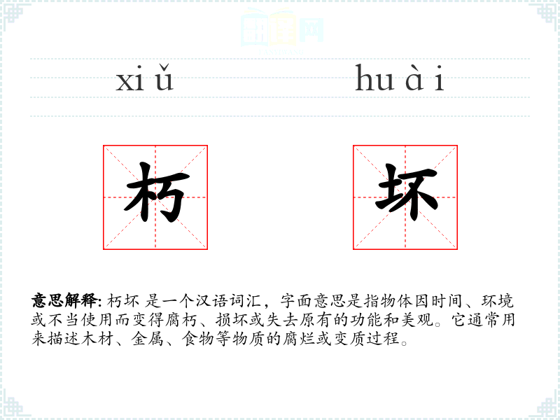 - 口语:在日常对话中,“朽坏”可能用来形容物品的老化或损坏,如“这家具已经朽坏了,需要更换”。