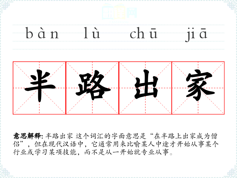 半路出家 这个词汇的字面意思是“在半路上出家成为僧侣”,但在现代汉语中,它通常用来比喻某人中途才开始从事某个行业或学*某项技能,而不是从一开始就专业从事。