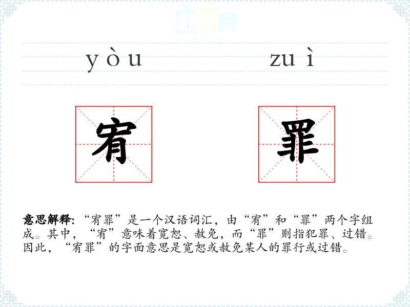 “宥罪”是一个汉语词汇,由“宥”和“罪”两个字组成。其中,“宥”意味着宽恕、赦免,而“罪”则指犯罪、过错。因此,“宥罪”的字面意思是宽恕或赦免某人的罪行或过错。