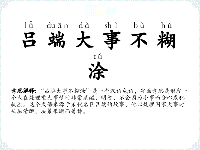 这个成语来源于宋代名臣吕端的故事。吕端在处理国家大事时以清醒和果断著称,因此后人用“吕端大事不糊涂”来形容在关键时刻能够保持清醒和明智的人。随着时间的推移,这个成语被广泛应用于各种语境中,成为赞扬他人智慧和冷静的常用表达。