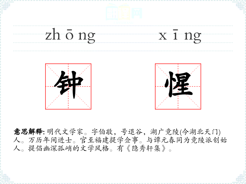 明代文学家。字伯敬,号退谷,湖广竟陵(今湖北天门)人。万历年间进士。官至福建提学佥事。与谭元春同为竟陵派创始人。提倡幽深孤峭的文学风格。有《隐秀轩集》。
