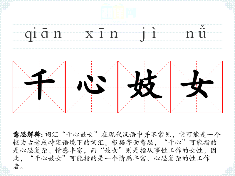 - 词源:这个词汇可能是由“千心”和“妓女”两个词组合而成,强调了妓女的内心世界。