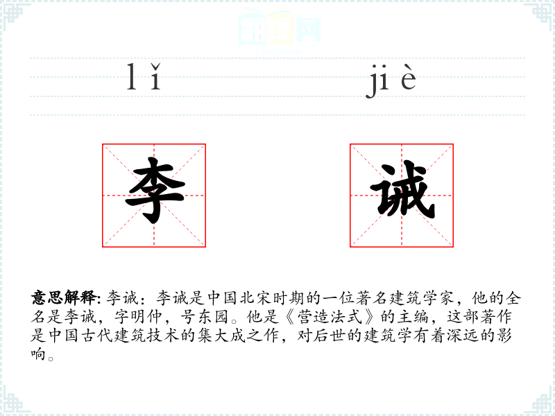 李诫:李诫是北宋时期的一位著名建筑学家,他的全名是李诫,字明仲,号东园。他是《营造法式》的主编,这部著作是古代建筑技术的集大成之作,对后世的建筑学有着深远的影响。