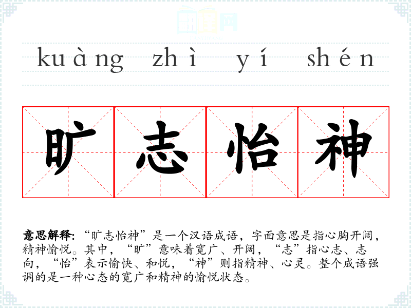 “旷志怡神”是一个汉语成语,字面意思是指心胸开阔,精神愉悦。其中,“旷”意味着宽广、开阔,“志”指心志、志向,“怡”表示愉快、和悦,“神”则指精神、心灵。整个成语强调的是一种心态的宽广和精神的愉悦状态。