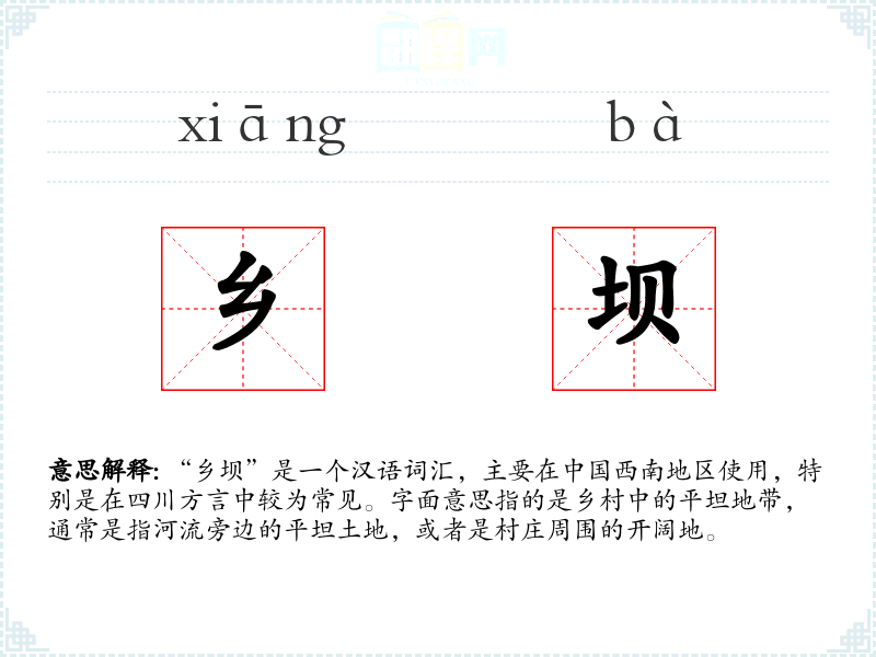 “乡坝”是一个汉语词汇,主要在**西南地区使用,特别是在四川方言中较为常见。字面意思指的是乡村中的平坦地带,通常是指河流旁边的平坦土地,或者是村庄周围的开阔地。