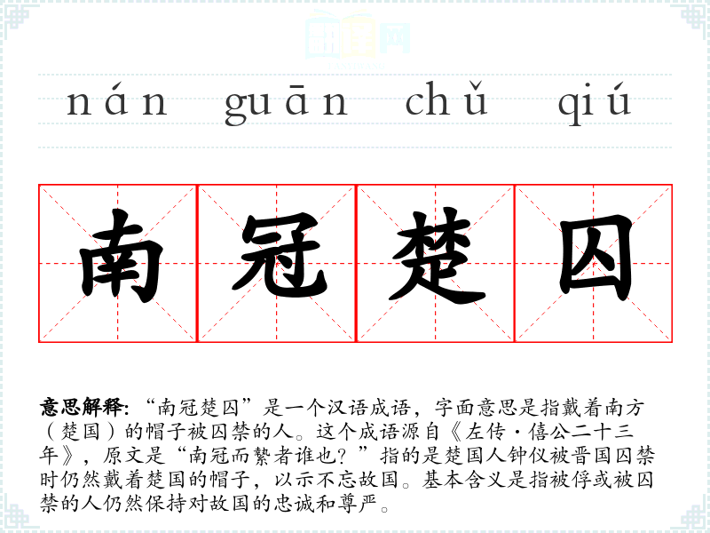 “南冠楚囚”是一个汉语成语,字面意思是指戴着南方(楚国)的帽子被囚禁的人。这个成语源自《左传·僖公二十三年》,原文是“南冠而縶者谁也?”指的是楚国人钟仪被晋国囚禁时仍然戴着楚国的帽子,以示不忘故国。基本含义是指被俘或被囚禁的人仍然保持对故国的忠诚和尊严。