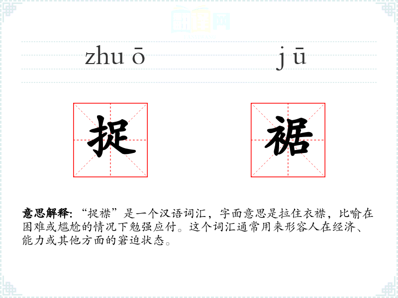 “捉襟”是一个汉语词汇,字面意思是拉住衣襟,比喻在困难或尴尬的情况下勉强应付。这个词汇通常用来形容人在经济、能力或其他方面的窘迫状态。