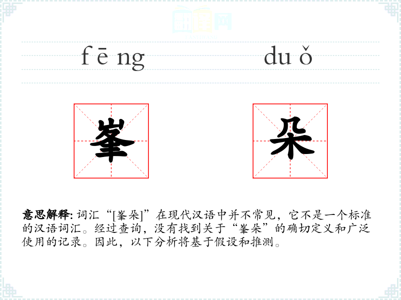 词汇“[峯朵]”在现代汉语中并不常见,它不是一个标准的汉语词汇。经过查询,没有找到关于“峯朵”的确切定义和广泛使用的记录。因此,以下分析将基于假设和推测。
