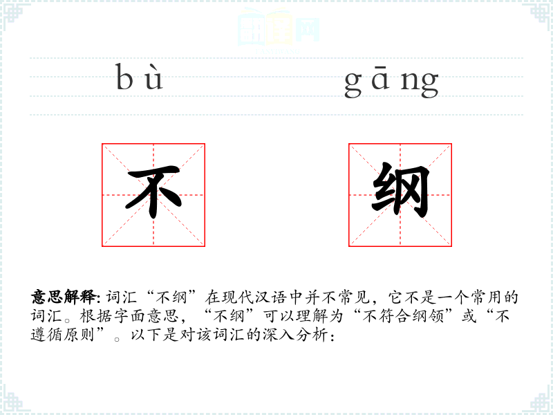 由于“不纲”不是一个常用词汇,它在文学、口语或专业领域中的使用非常有限。在某些特定的文献或古文中,可能会出现这个词,用以批评或描述某些行为或事物不符合既定的规范或原则。