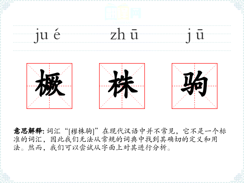 词汇“[樛株驹]”在现代汉语中并不常见,它不是一个标准的词汇,因此我们无法从常规的词典中找到其确切的定义和用法。然而,我们可以尝试从字面上对其进行分析。