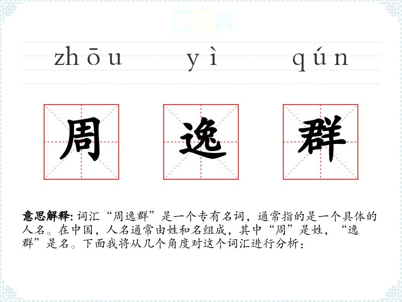 词汇“周逸群”是一个专有名词,通常指的是一个具体的人名。在**,人名通常由姓和名组成,其中“周”是姓,“逸群”是名。下面我将从几个角度对这个词汇进行分析: