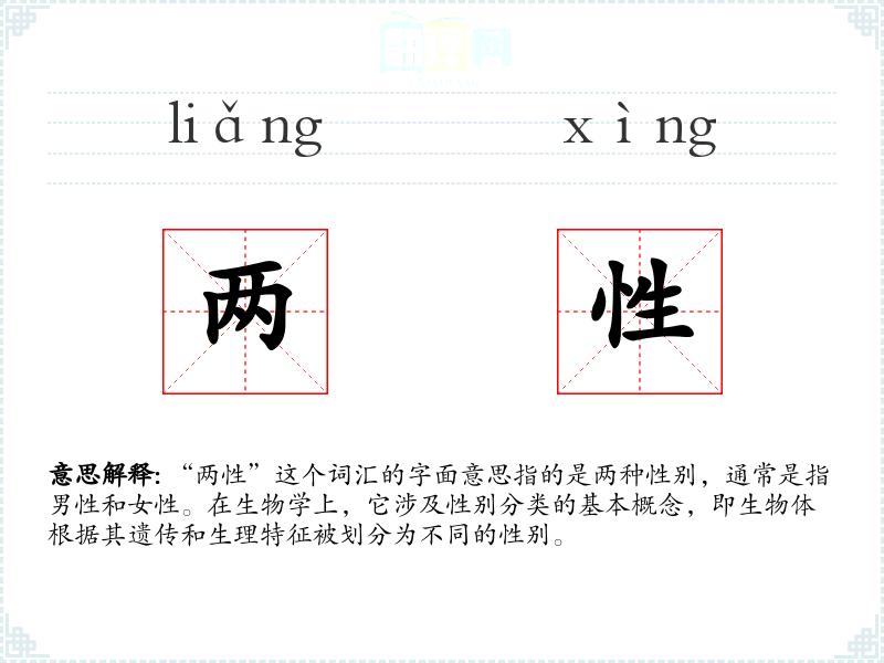 - 反义词:无(因为“两性”本身是一个中性词,没有直接的反义词)